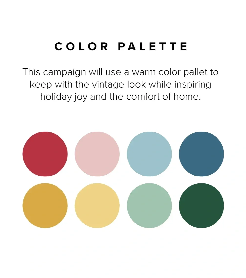 Each member of the creative team presented a different concept and style for the campaign, ultimately voting in favor of actioning on my colleague’s idea: Holiday Cheers. Inspired by vintage ads, the campaign aesthetic would be a nod to traditions of old.